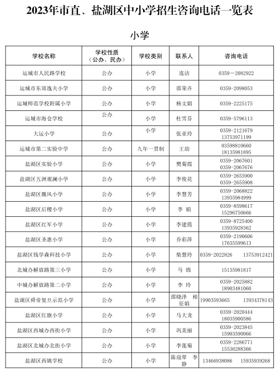 根据教育部办公厅《关于做好2023年普通中小学招生入学工作的通知》(教基厅〔2023〕1号)、山西省教育厅《关于做好2023年普通中小学招生入学工作的通知》(晋教基〔2023〕8号)、运城市教育局《关于做好2023年普通中小学招生入学工作的通知》(运教基〔2023〕34号)等相关文件精神,结合城区实际,特制定运城市中心城区2023年义务教育学校招生实施办法。